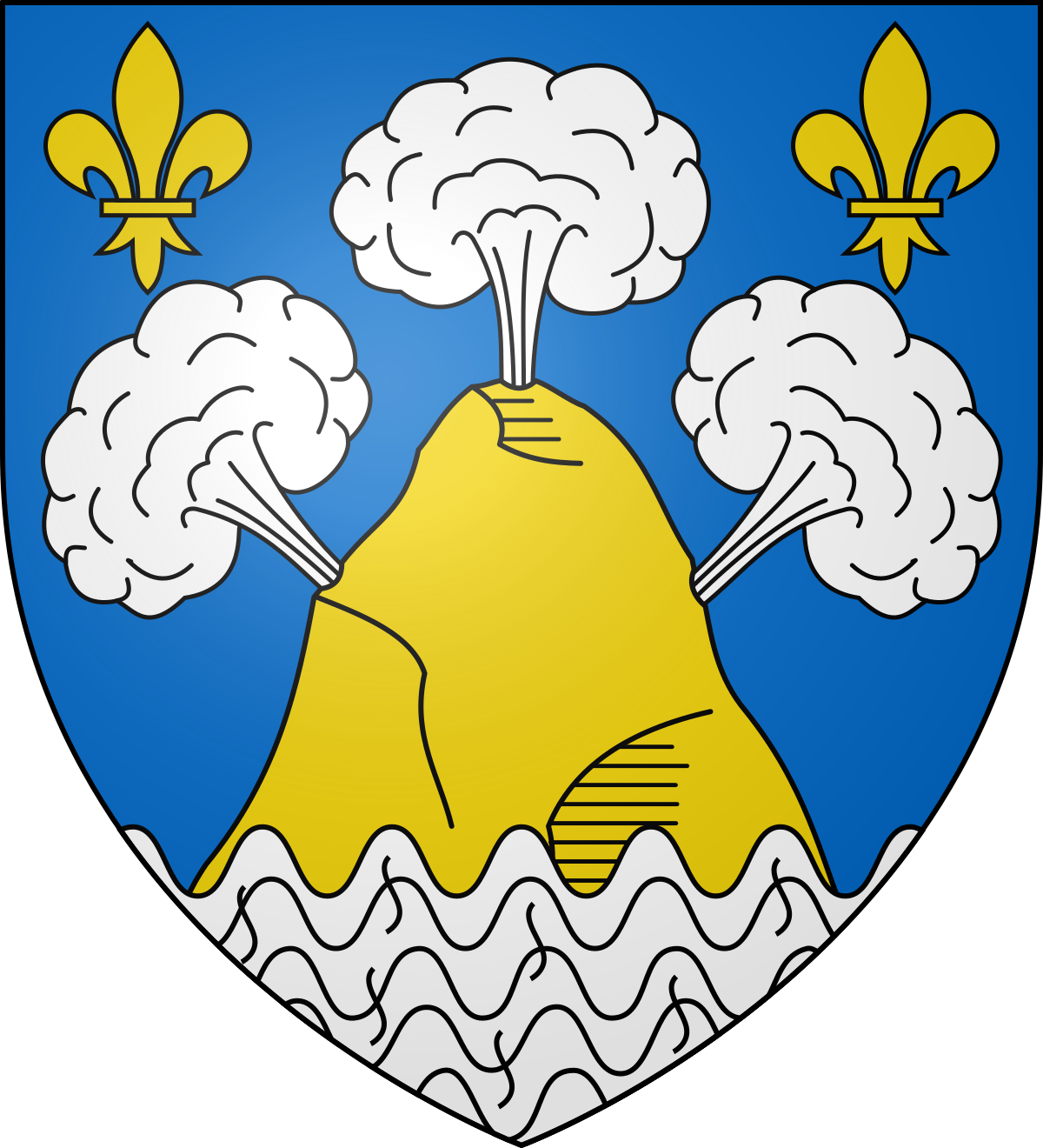 | D'azur à la montagne d'or d'où s'échappent trois fumerolles d'argent, mouvant d'un bouillon d'eau fumante d'argent, surmontée de deux fleurs de lys d'or rangées en chef |